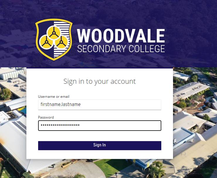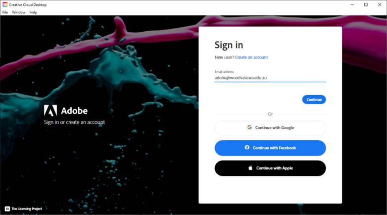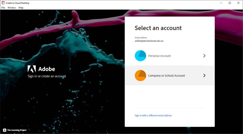 in, at the Adobe screen below use adobe@woodvale.wa.edu.au as the email address and select “Company or School Account” on the next