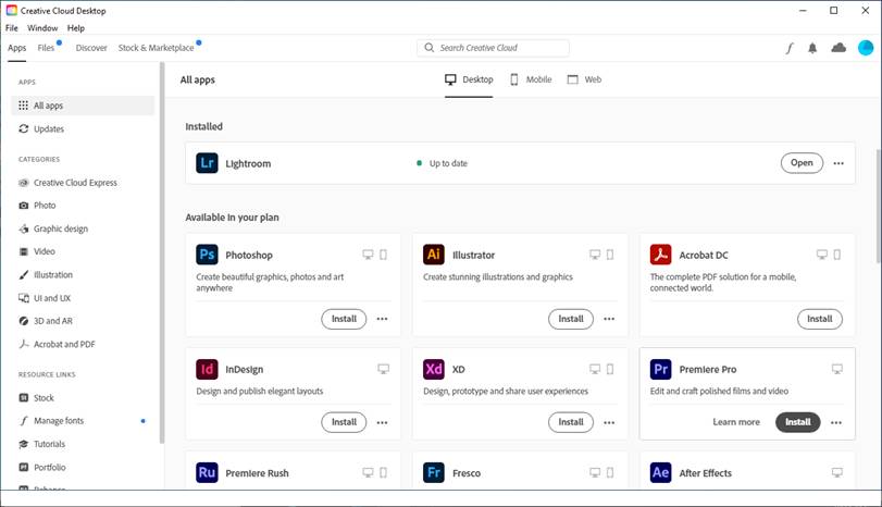 can now install any Adobe software through the Creative Cloud Client – you can also install the programs at home.